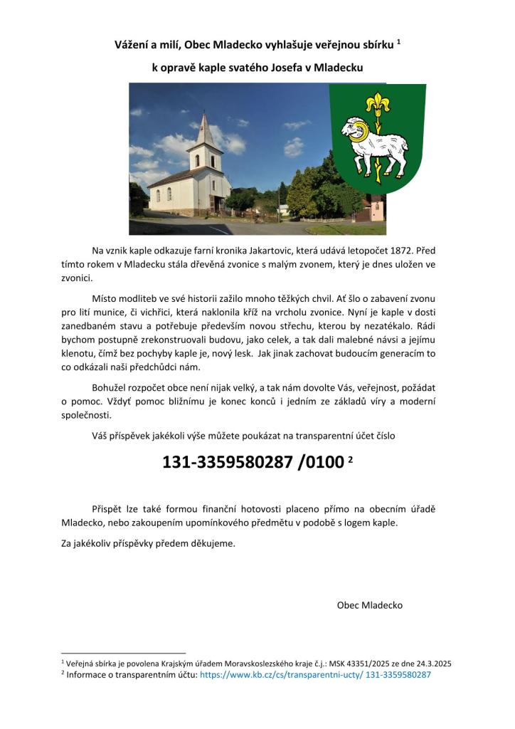 Bohužel rozpočet obce není nijak velký, a tak nám dovolte Vás, veřejnost, požádat o pomoc. Vždyť pomoc bližnímu je konec konců i jedním ze základů víry a moderní společnosti.