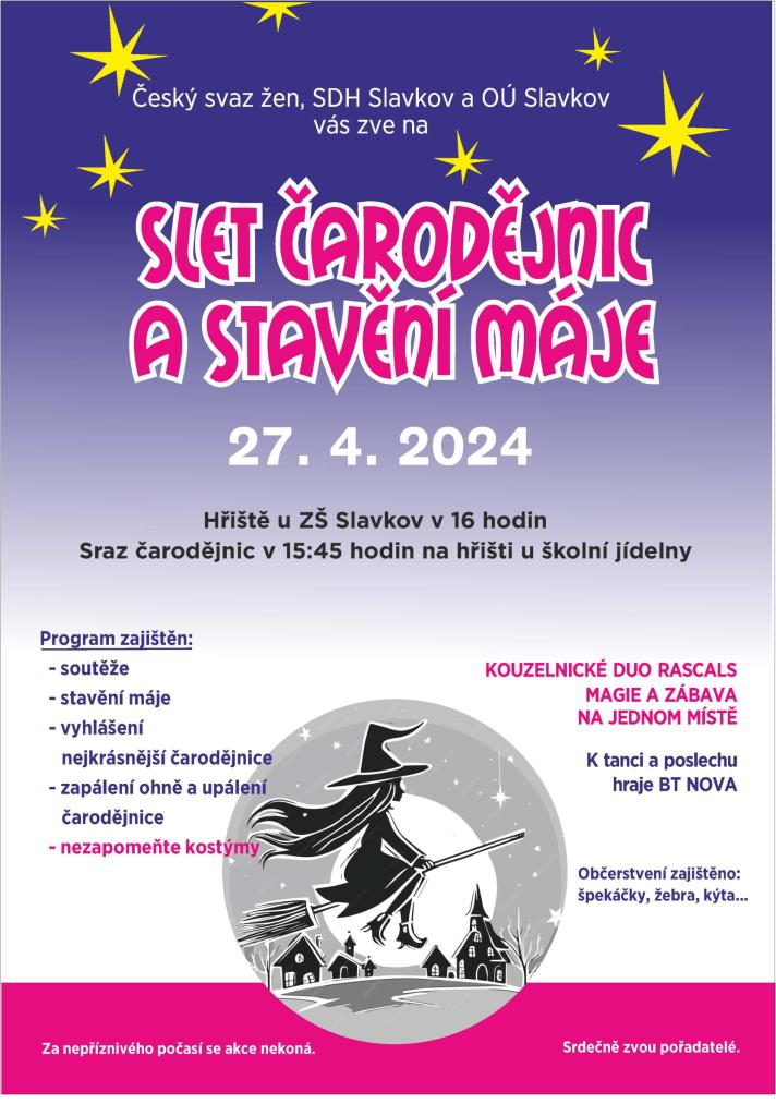 Sraz čarodějnic v 15:45 hodin na hřišti u školní jídelny.